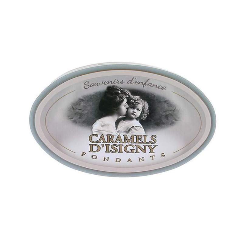 Les caramels d'Isigny assortis sont présentés dans une boîte en fer illsutrée d'une photo en noir et blanc d'une mère et sa fille. Les différentes saveurs de cette jolie boite sont : Vanille marbrée, chocolat, beurre salé.