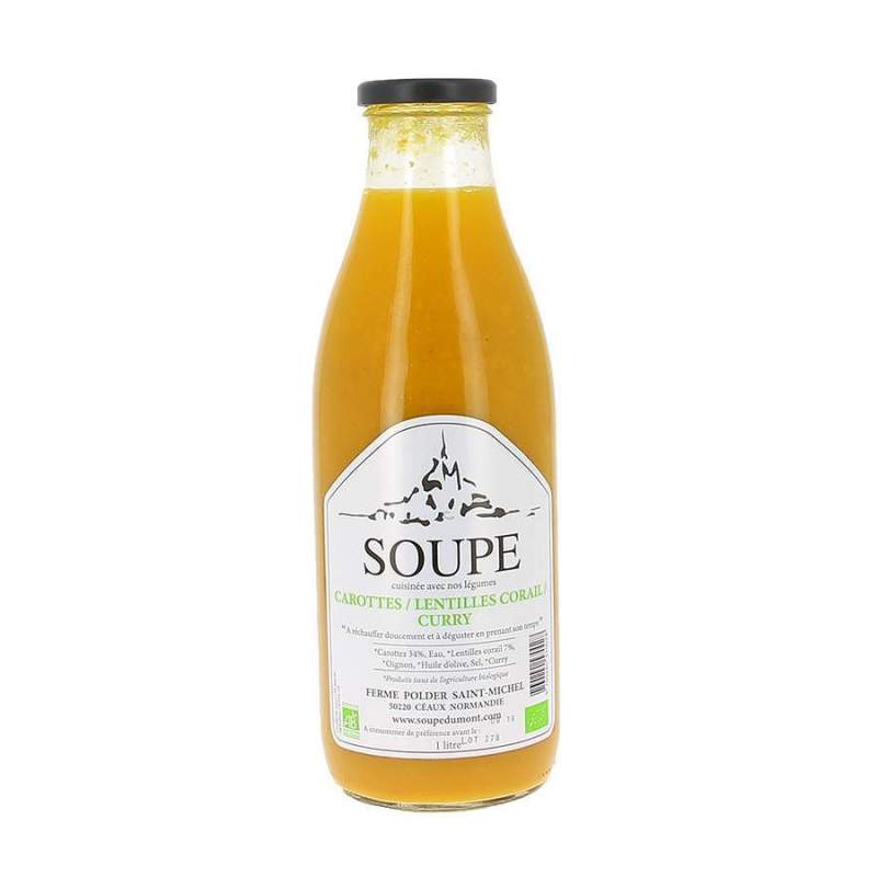 Ingrédients : Carottes 34%, Lentilles corail 7%,Oignon, Curry, Huile d’olive, Sel, Eau.